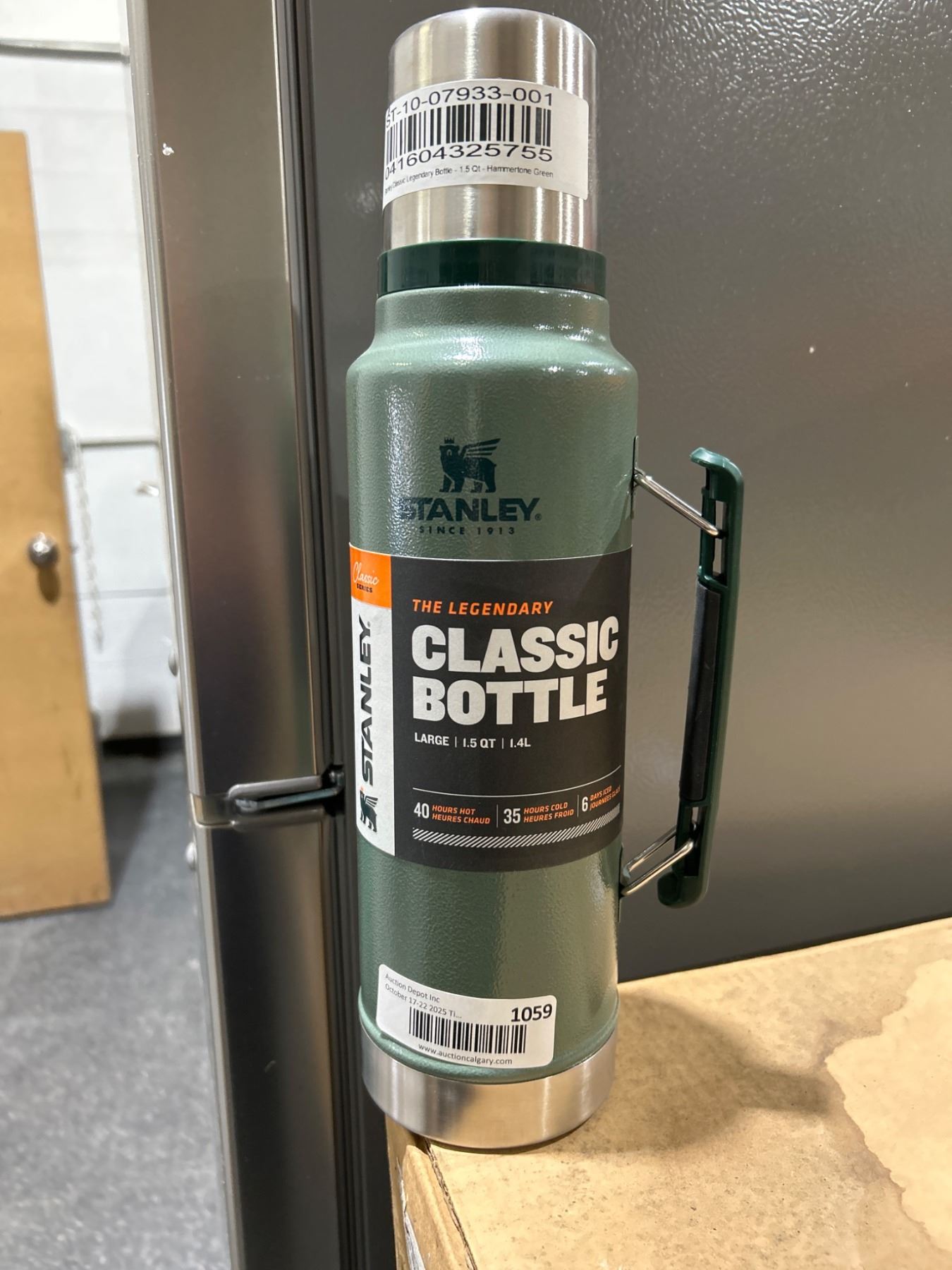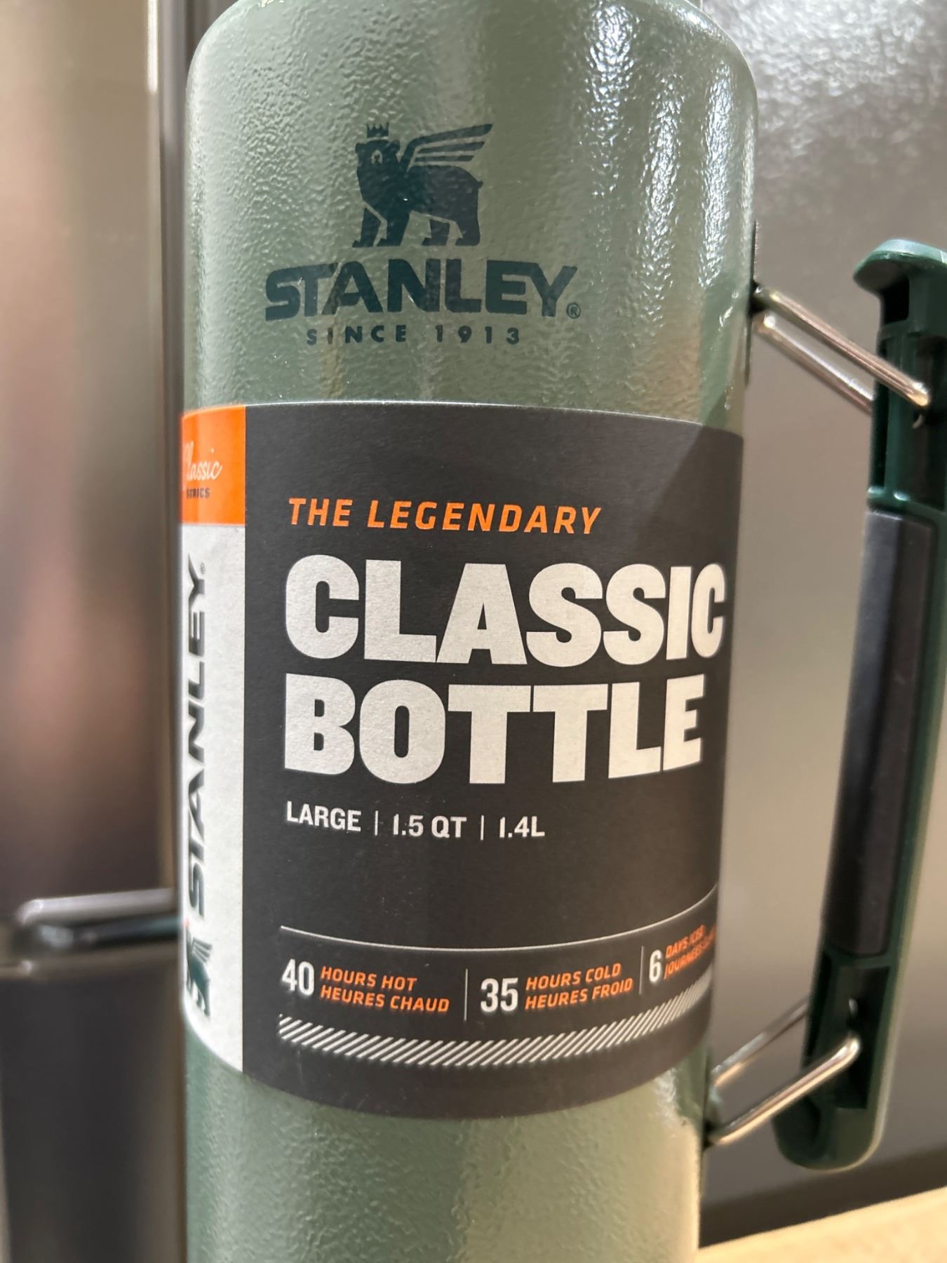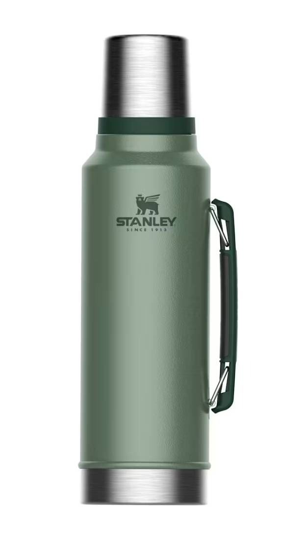 The Stanley Classic Bottle features a 1.5-quart (1.4-liter) capacity and is designed to retain temperatures for extended periods, keeping liquids hot for up to 40 hours and cold for up to 35 hours. This item includes a durable handle and is constructed with a green finish. It is part of Stanley's long-standing product line and is labeled 'The Legendary Classic Bottle.'