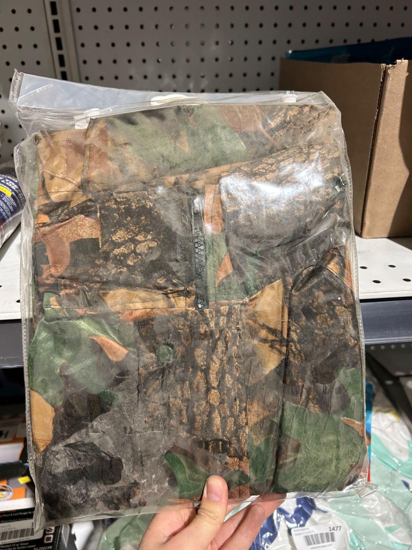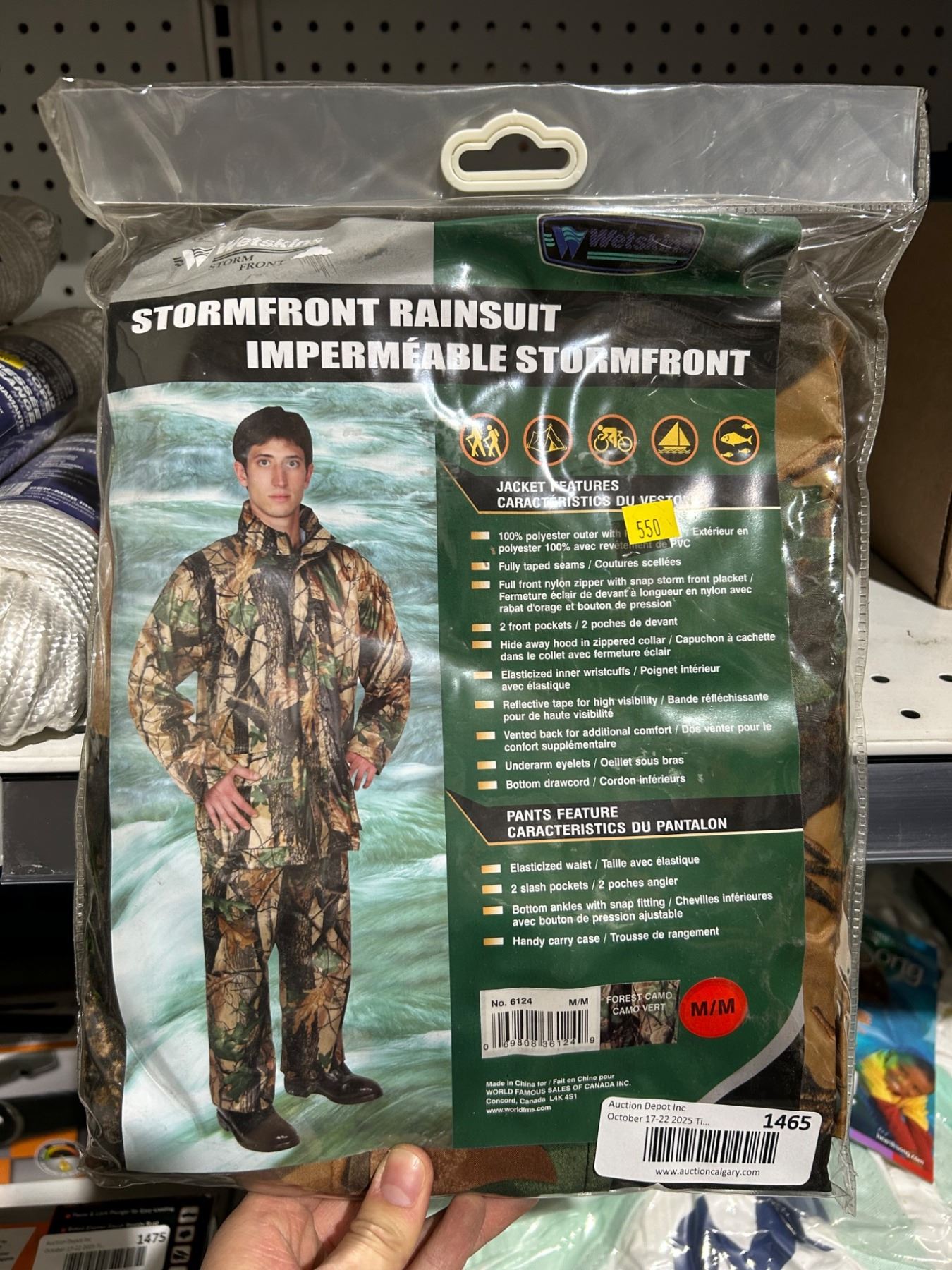 Stormfront Rainsuit featuring camouflage design suitable for outdoor activities. Includes jacket and pants, size medium to large (M/L). Constructed with material aimed at water resistance and durability. Product details and care instructions noted on packaging. Designed for multi-purpose use in varying weather conditions.