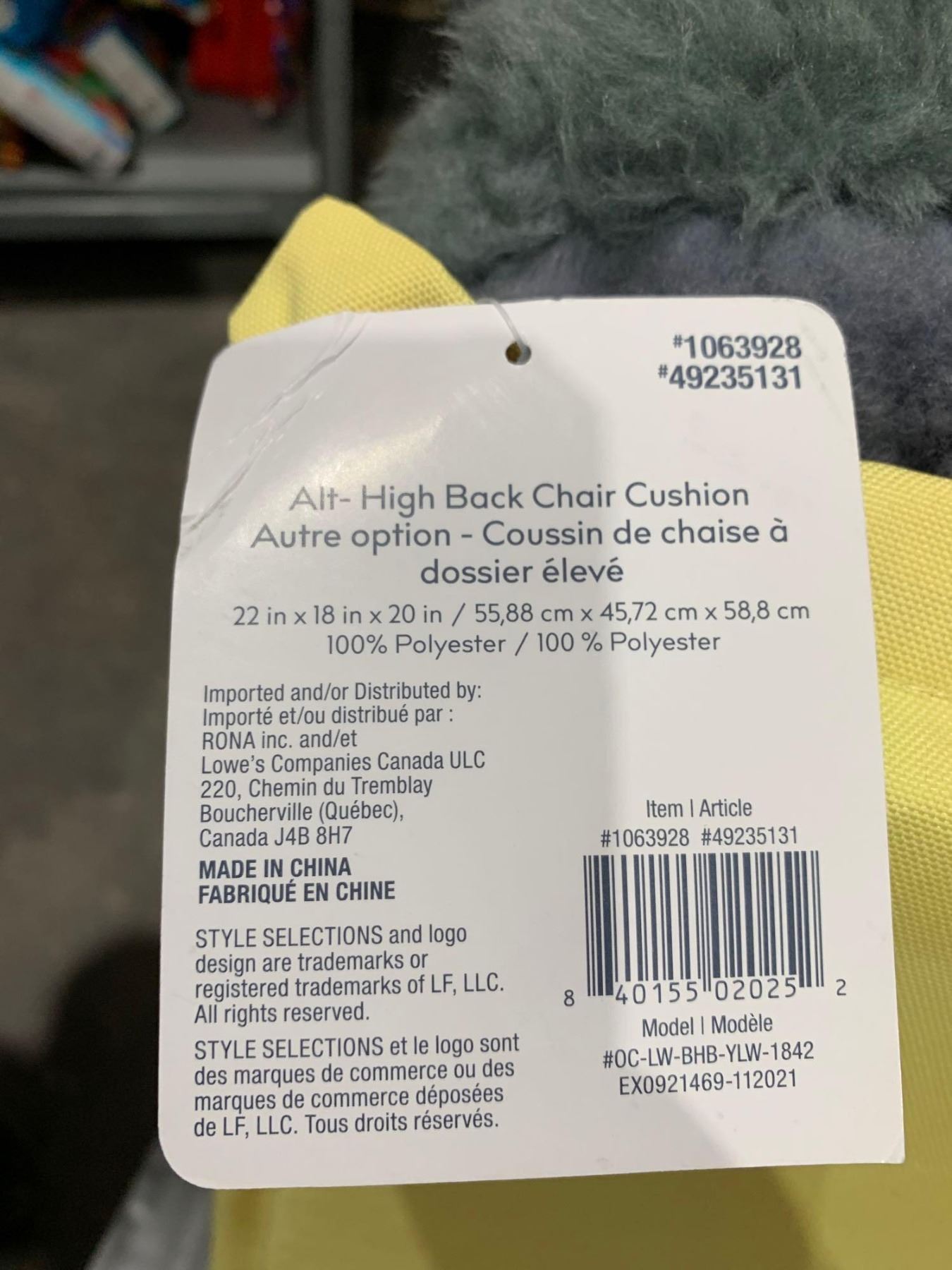Style Selections 22x18" Polyester Alt-High Back Chair Cushion - Yellow - Lot of 1