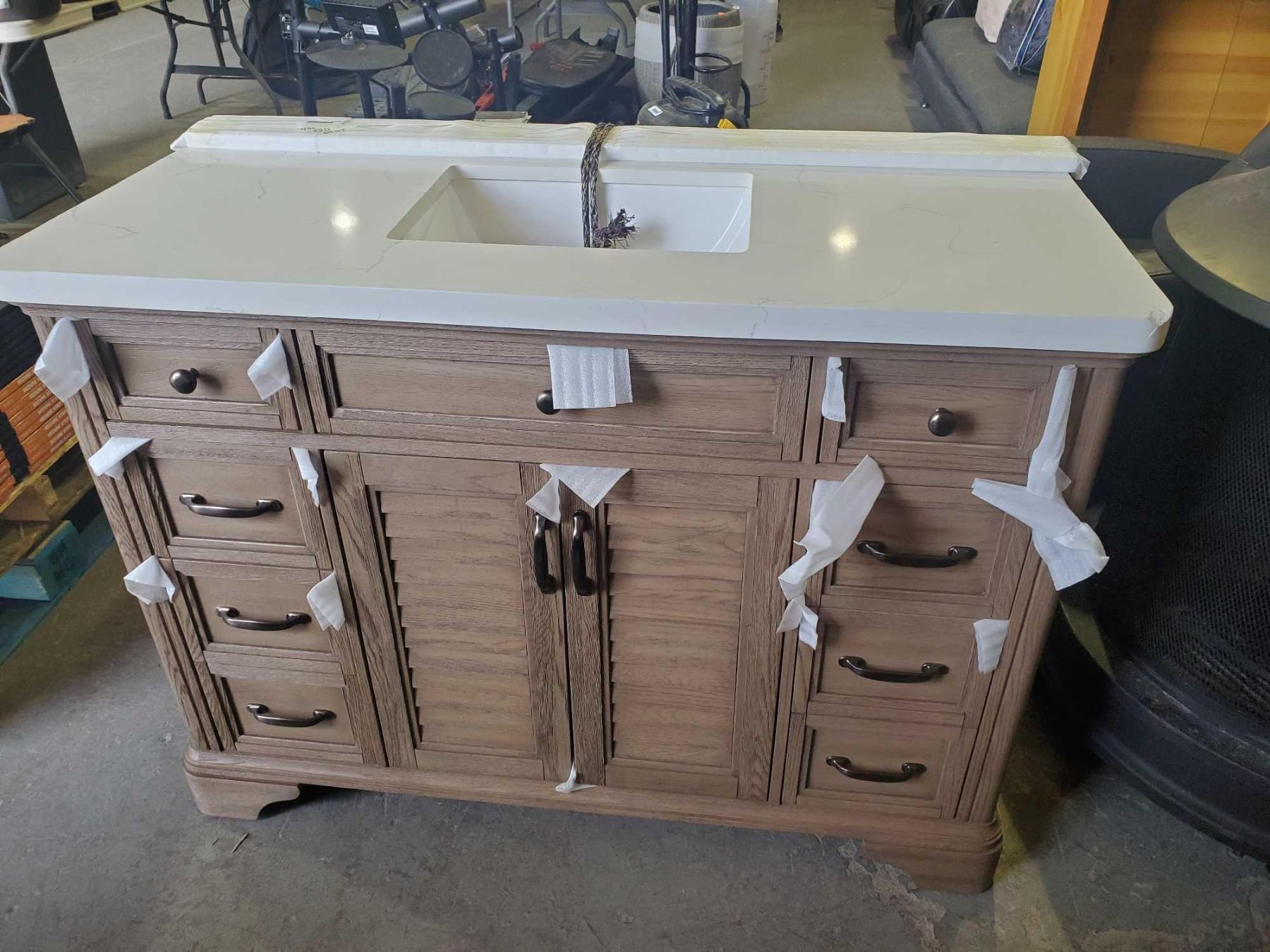 Tall Vanity with 8 Drawers, 1 Cupboard & One Face Plate Shelf, Vanity Has 2 built in Outlets and 2 USB Charging Ports, Marble Sink To - Slight Damage to one Corner as seen in photo - SOLD AS IS