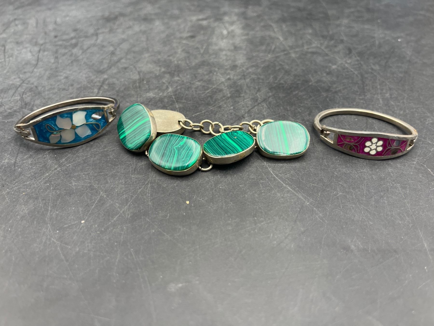 Three Jewelry Items Featuring Green Cabochon and Floral Designs