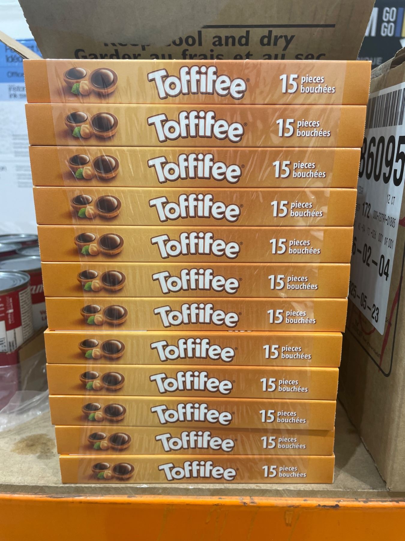This lot includes twelve (12) Toffifee 15-piece units, each weighing 123g. The product consists of individual candies combining hazelnuts, caramel, and chocolate. The nutritional and ingredient information is clearly labeled on the reverse side. Lot details include batch marking and date coding for reference.