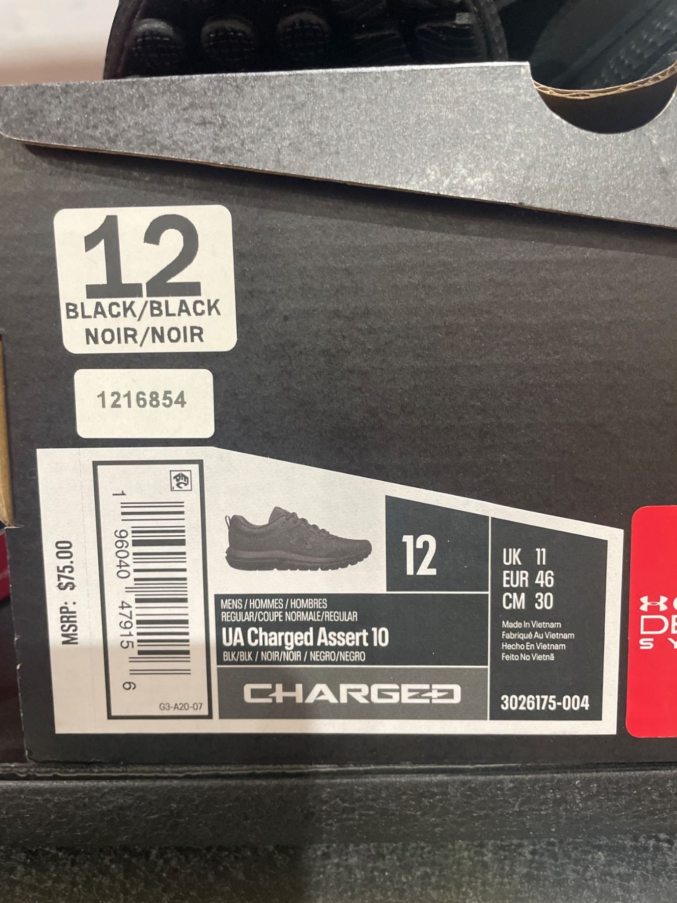 Under Armour Charged Assert 10 Running Shoes, Men’s Size 12, Black/Black