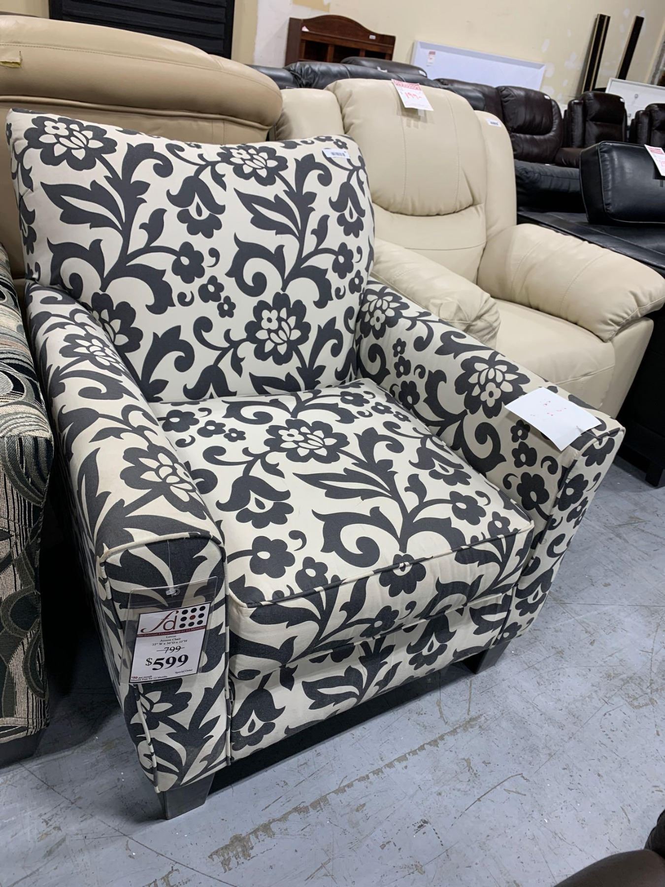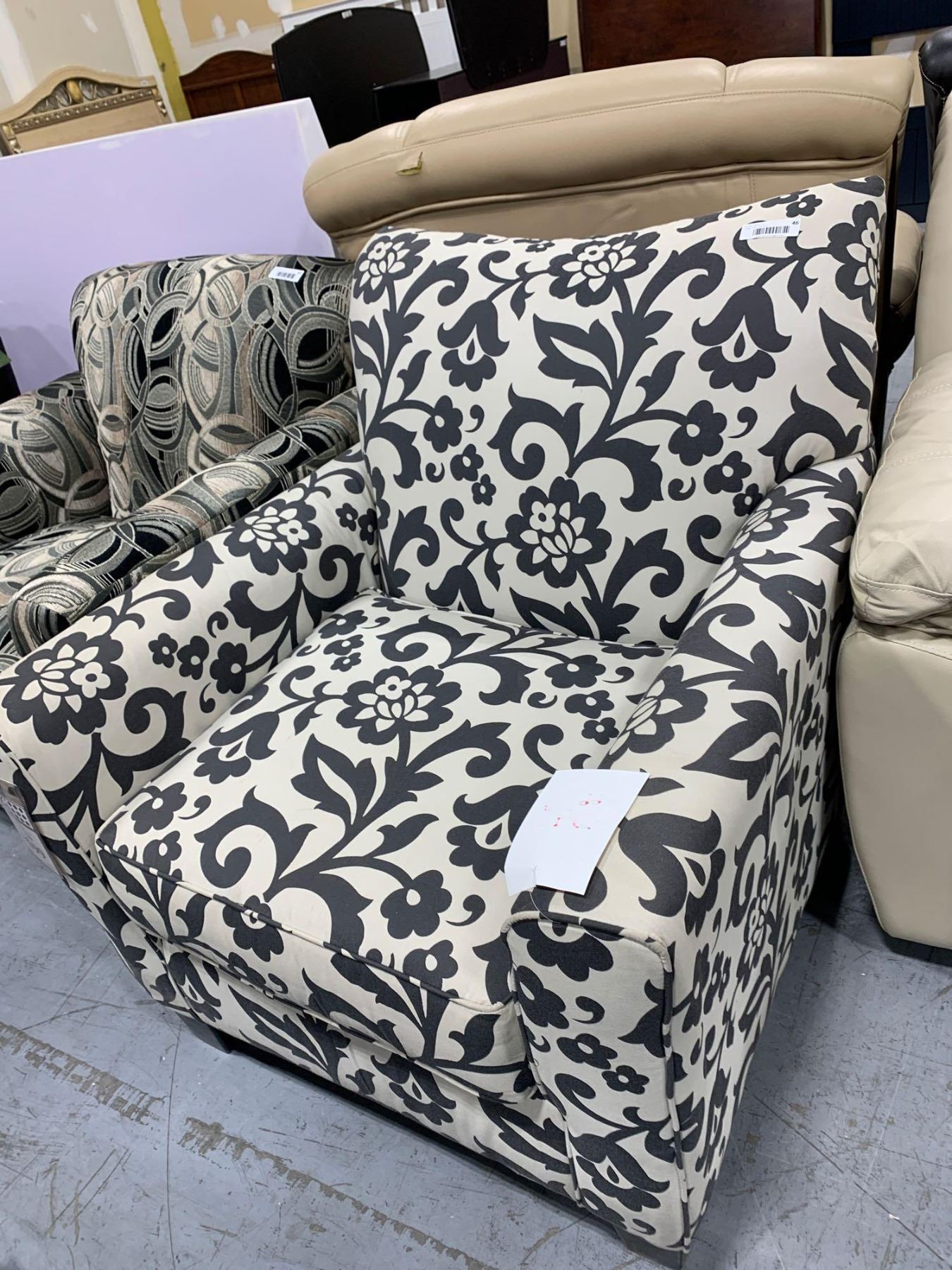 Upholstered black  white floral print sofa chair