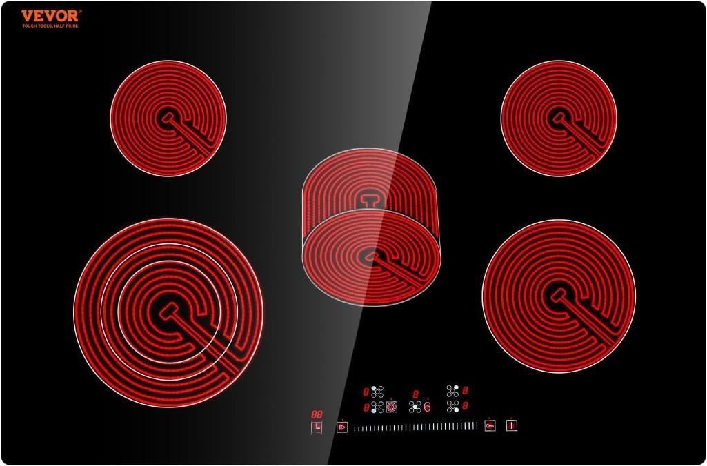 VEVOR Built in Electric Stove Top, 30.3 x 20.5 inch 5 Burners, 240V Glass Radiant Cooktop with Sensor Touch Control, Timer & Child Lock Included, 9 Power Levels for Simmer Steam Slow Cook Fry