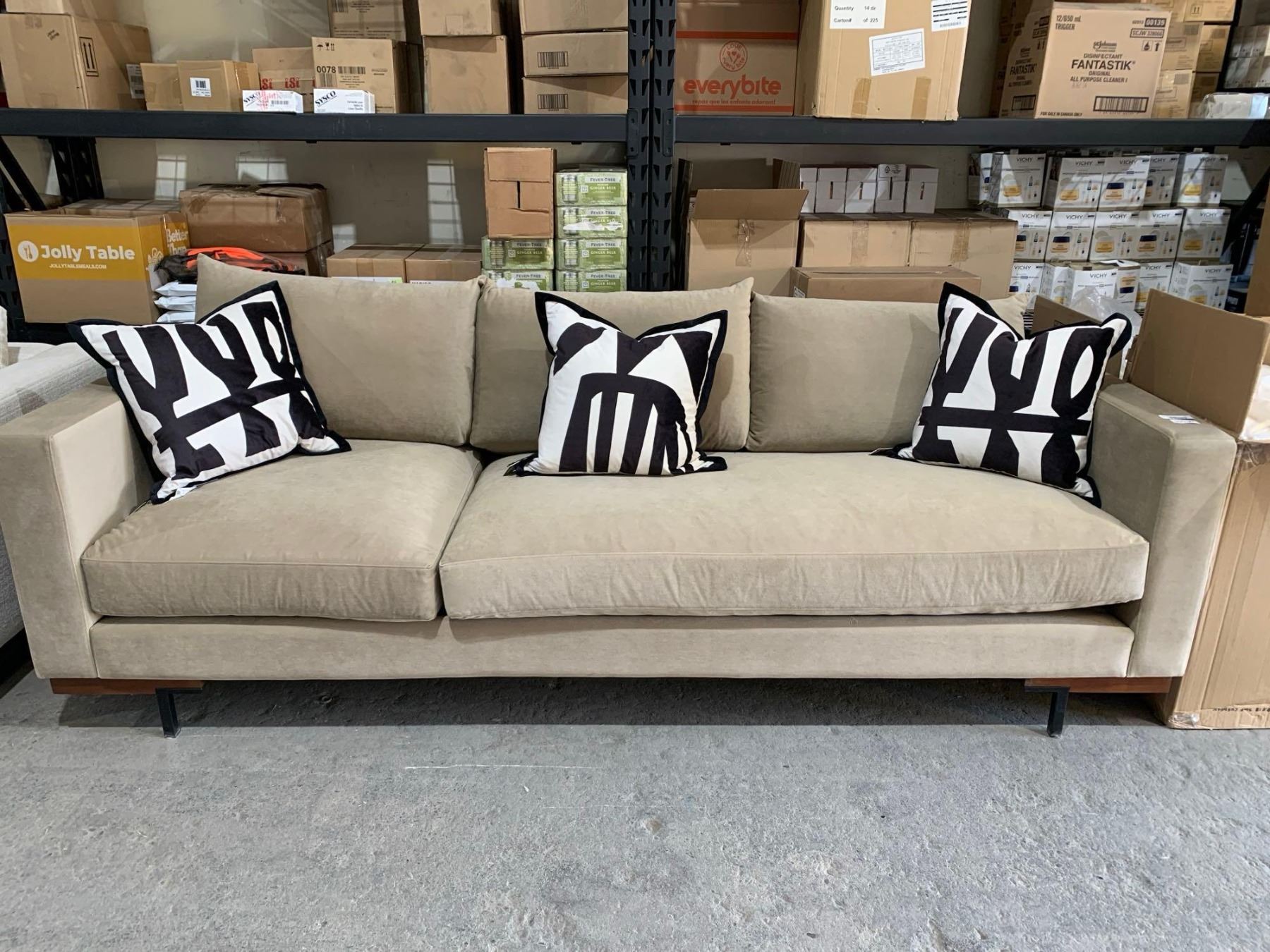 Velour Style Sofa 101" x 38" Tan with 3 Throw Pillows