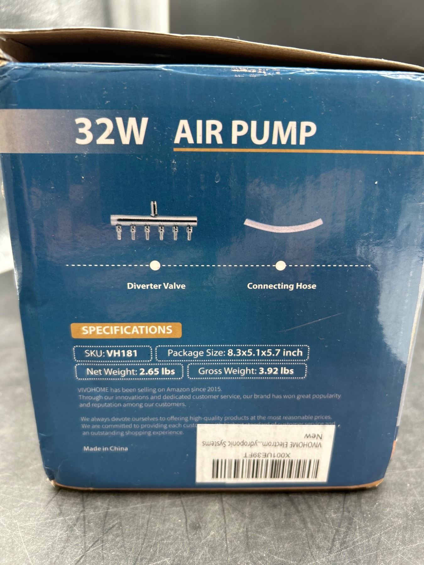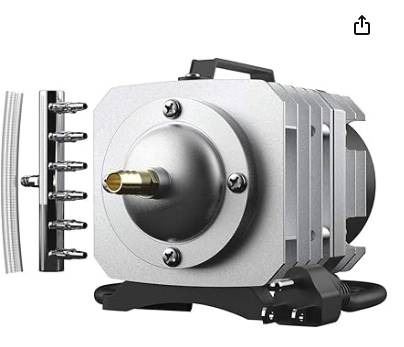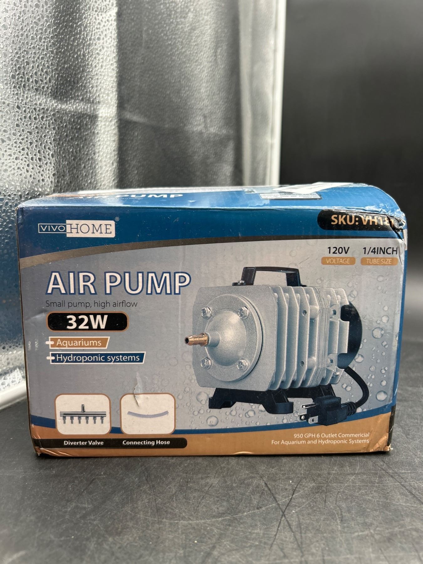 The VivoHome 32W Air Pump, model VH611, delivers powerful functionality for aquariums and hydroponic systems. Operating at 120V with a 1/4-inch outlet, this pump is lightweight at 2.65 lbs and has a gross weight of 3.92 lbs. The product’s dimensions are 8.3 x 5.1 x 5.7 inches. Includes a diverter valve and connecting hose for efficient operation.