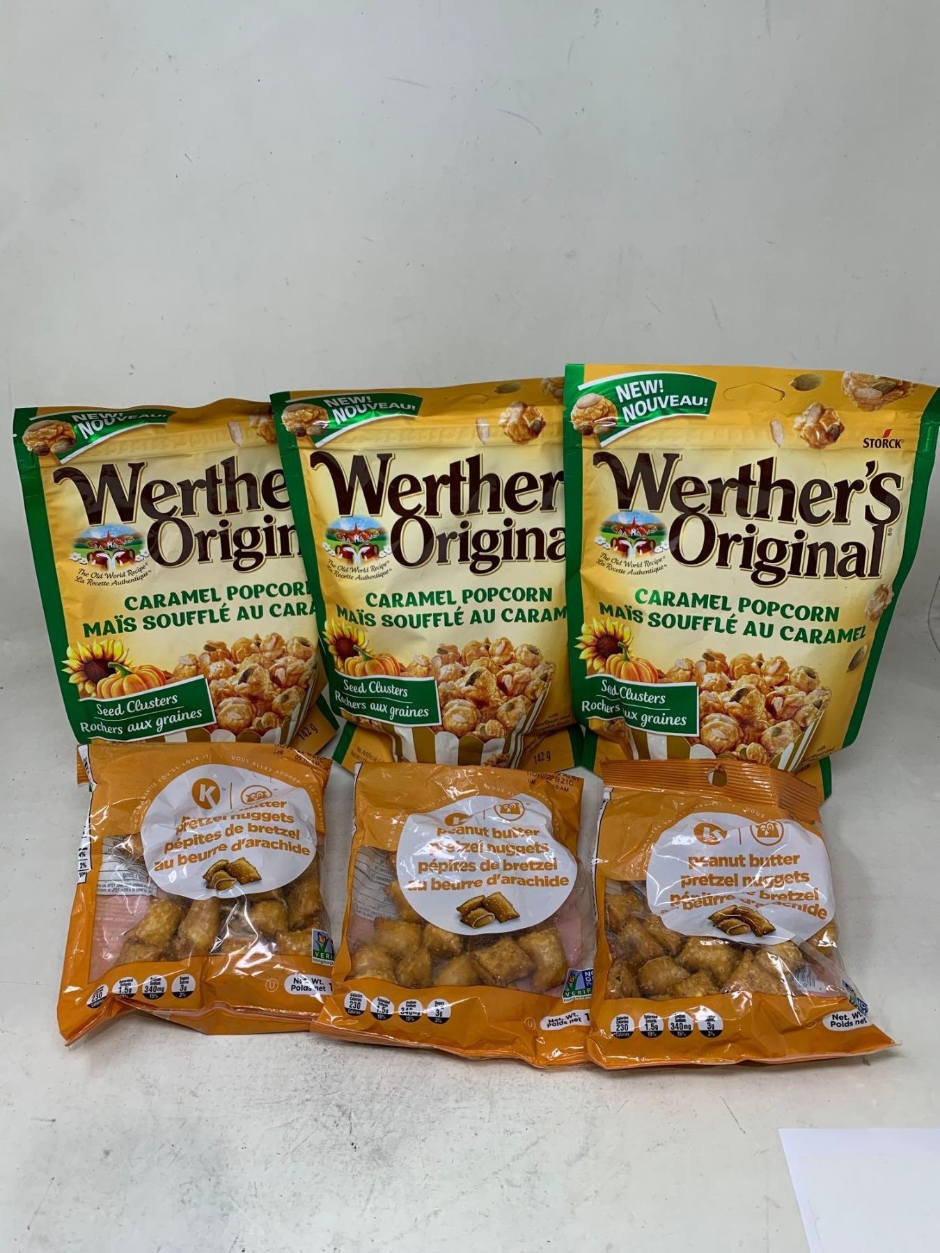 Werthers Original Caramel Popcorn (3 x 142g) Peanut Butter Pretzel Nuggets (3 x 113g)