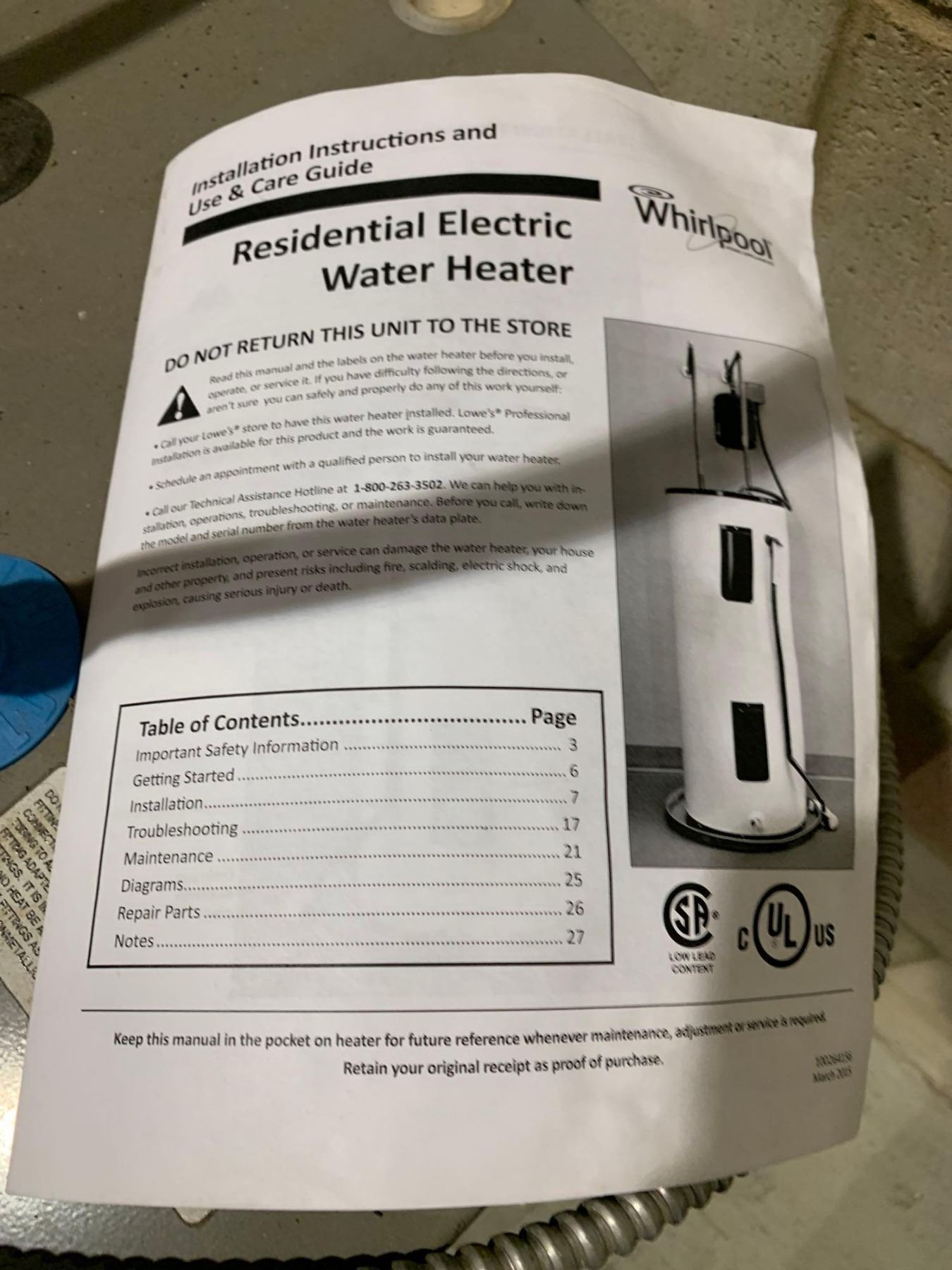 Whirlpool 50 Gal 2500W Water Heater, buyer must disconnect