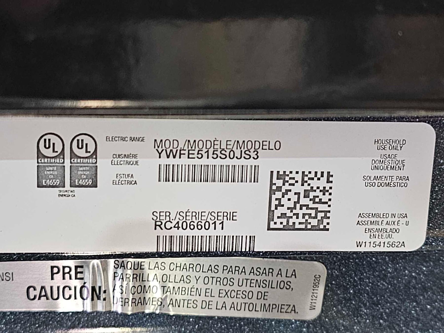 Whirlpool YWFE515S0JS Range, Electric, 30 inch Exterior Width, Self Clean, 4 Burners, 5.3 cu. ft. Ca