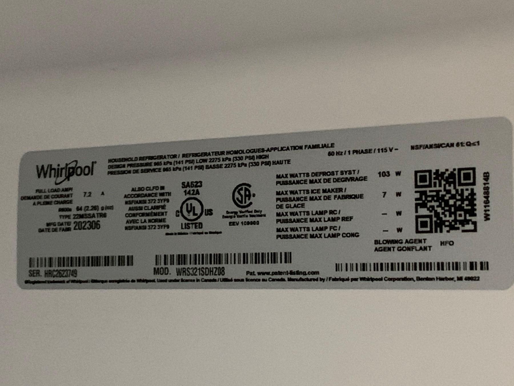 Whirlpool stainless steel french door style fridge and freezer. Model number WRS321SDHZ08