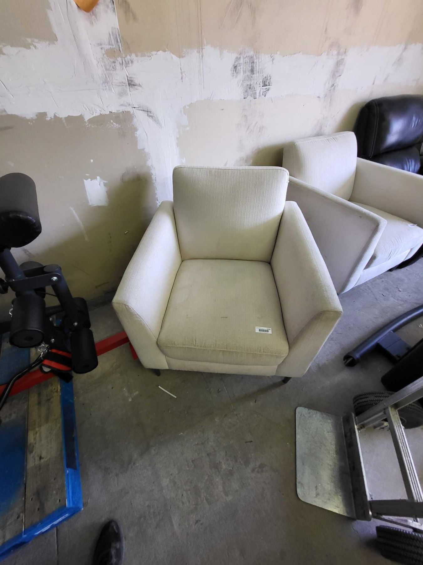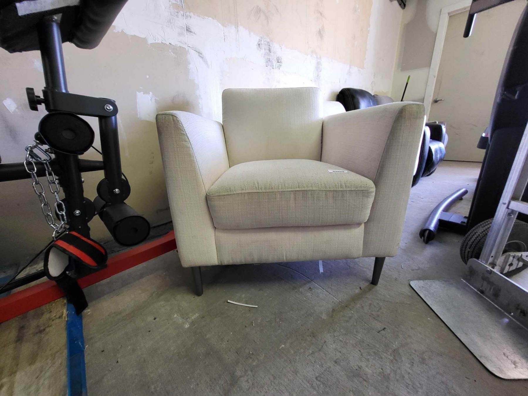 White Upholstered Arm Chair with Wooden Legs