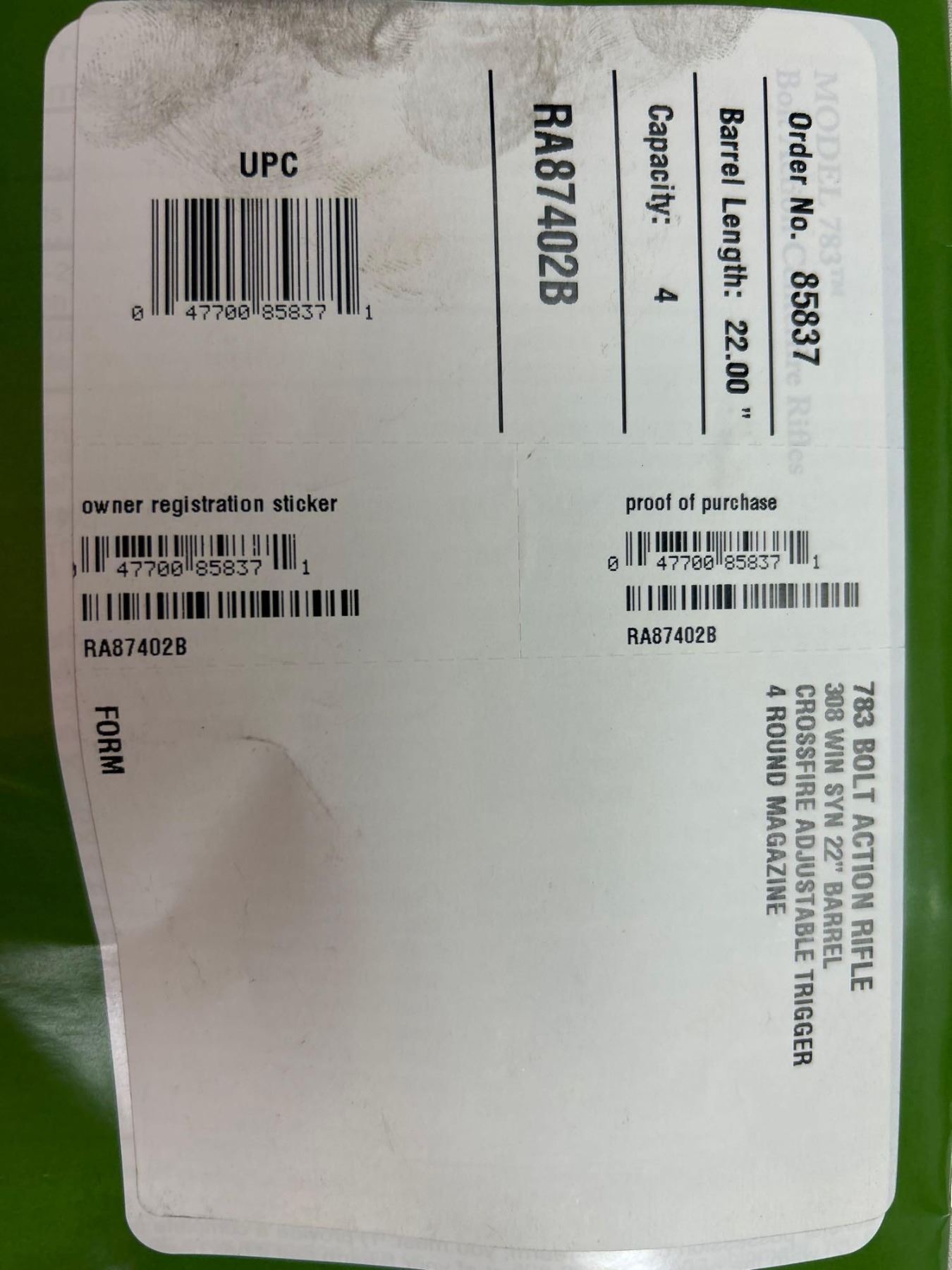 Winchester Model 783 Bolt Action .308 Win Synthetic Stock, 22" barrel with crossfire adjustable trigger, detached mag. with Ohhunt  Variable Scope Serial #RA87402B * YOU MUST POSSESS AND PRODUCE A VALID PAL TO BID ON THIS ITEM*