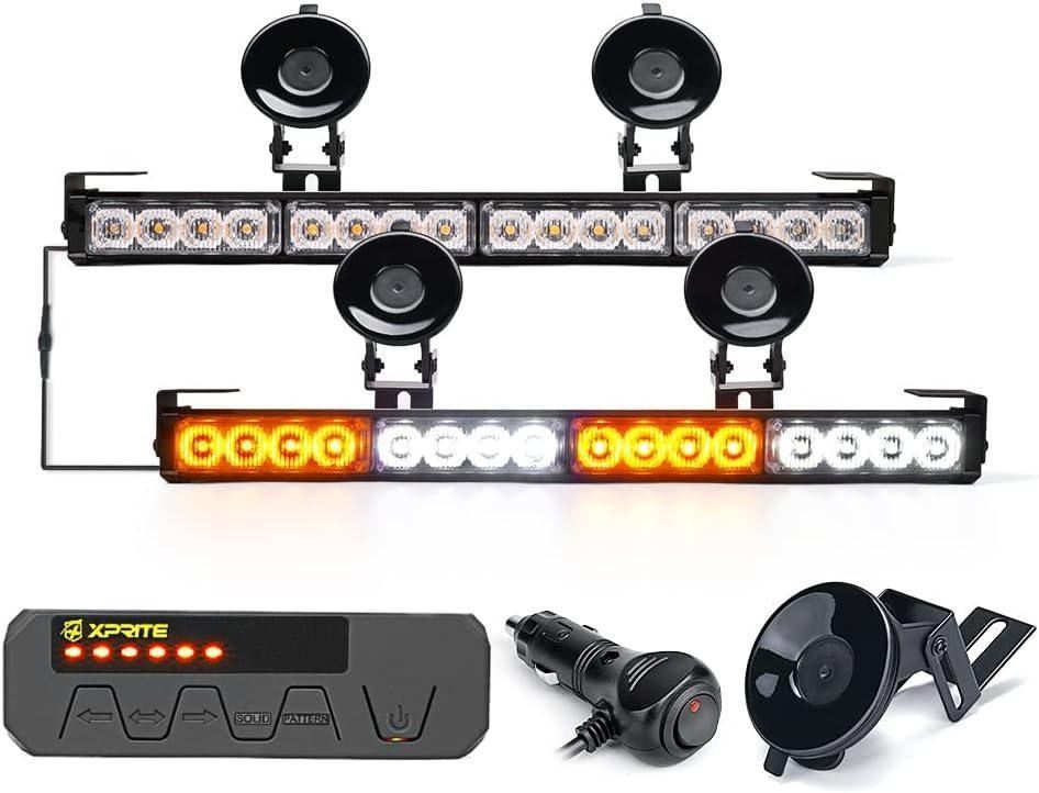 Xprite White Amber LED Emergency Traffic Advisor Strobe Dual Light Bar w/Control Box, Windshield Visor Suction Cup Safety Hazard Warning Flashing Lightbars, for Construction Vehicles Pickup Trucks
