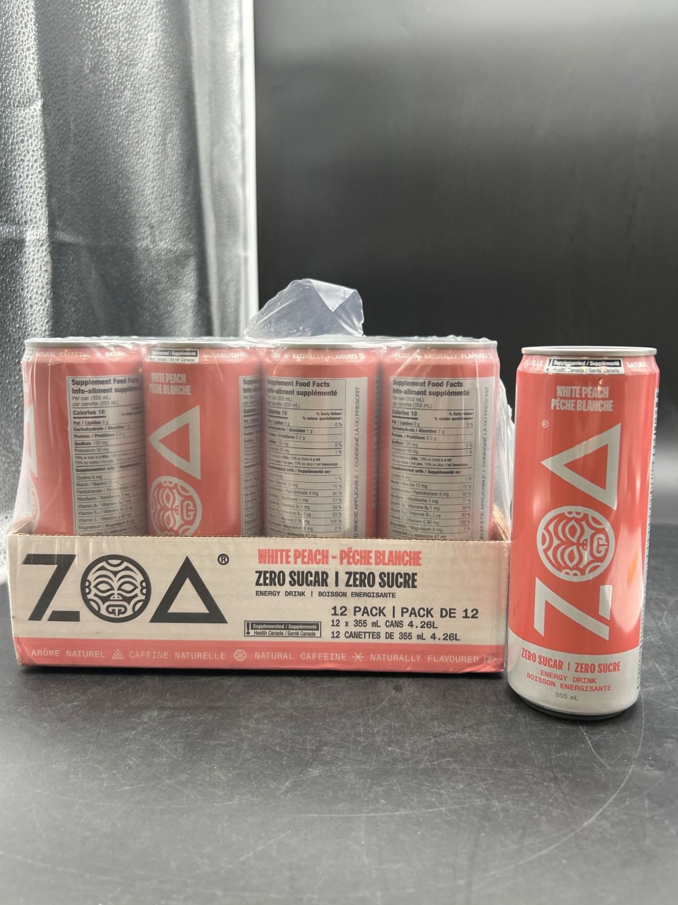 Zoa Zero Sugar White Peach Energy Drinks – 12 Pack x 355ml