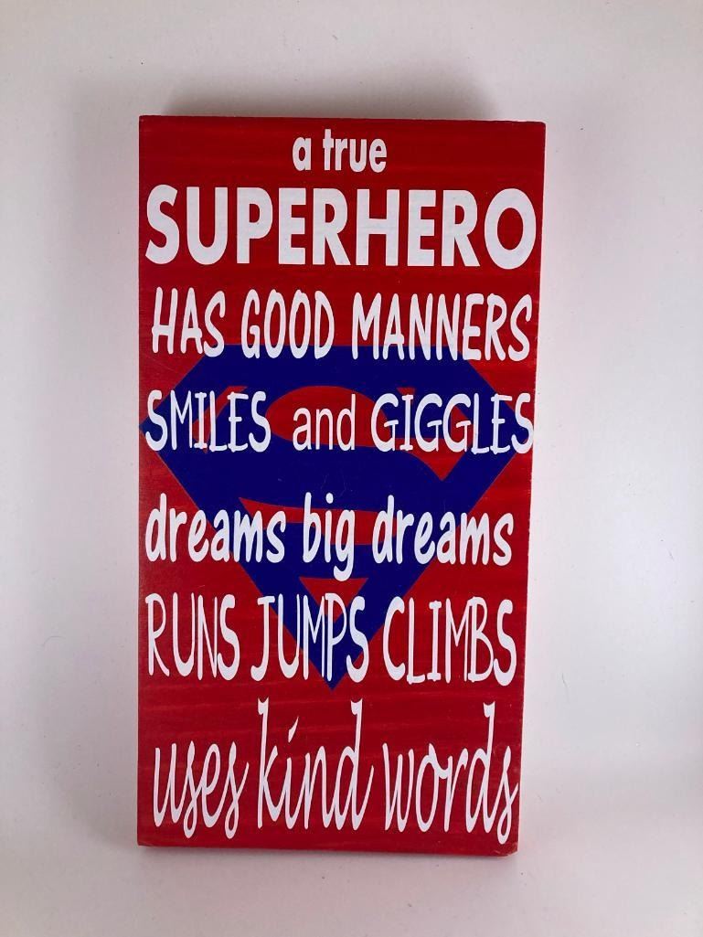 a true super hero has good manners, smiles and giggles, dreams big dreams, runs jumps climbs uses kind words (Red-Big Superman logo) 6X12 Inches. Made of Pine. Hooks on Back